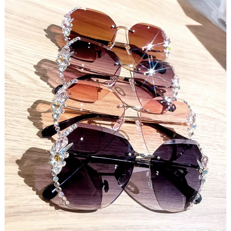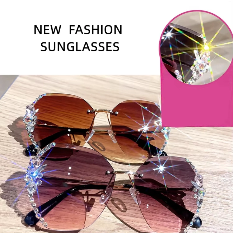 These 2025 New Trendy Sunglasses feature a diamond rimless design with rhinestone details, made from durable metal and PC lenses for 100% UV protection.
